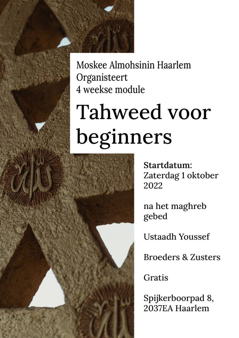 Moskee Almohsinin organisteert een 4 weekse module, elke zaterdag vanaf 1 oktober over het belangrijkste onderdeel van jouw religie: At-Tawheed (de eenheid van Allah).